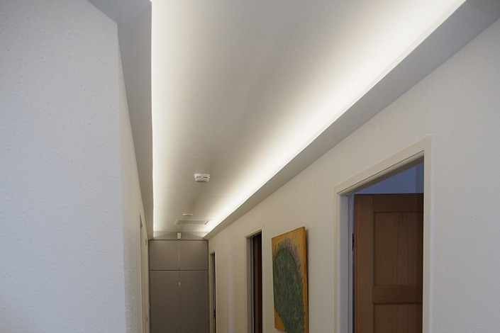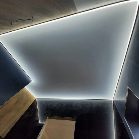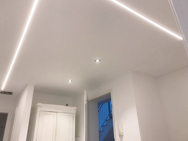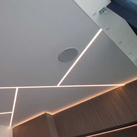 С ее помощью легко зонировать пространство, что особенно актуально для квартир-студий или просто больших пространств с логически разными участками. С помощью полос света, ниш или треков вы сможете отделить одну часть комнаты от другой.